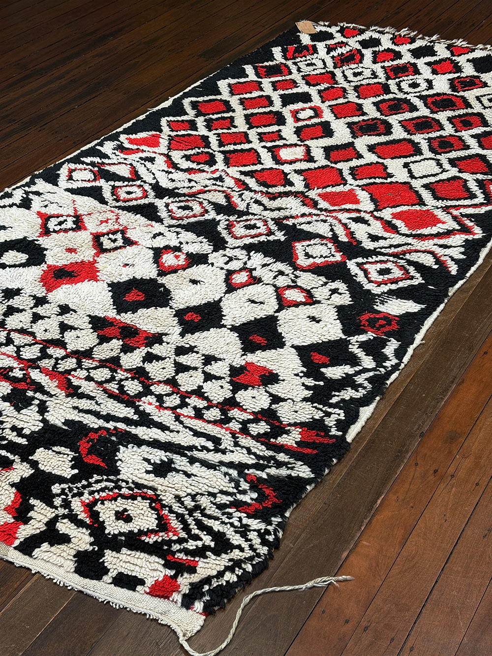 A hallmark of the Azilal Berber Rug is its symbolic vocabulary. Diamonds, zig-zags, and talismanic forms appear frequently, each carrying meanings that connect to fertility, protection, and the continuity of life.