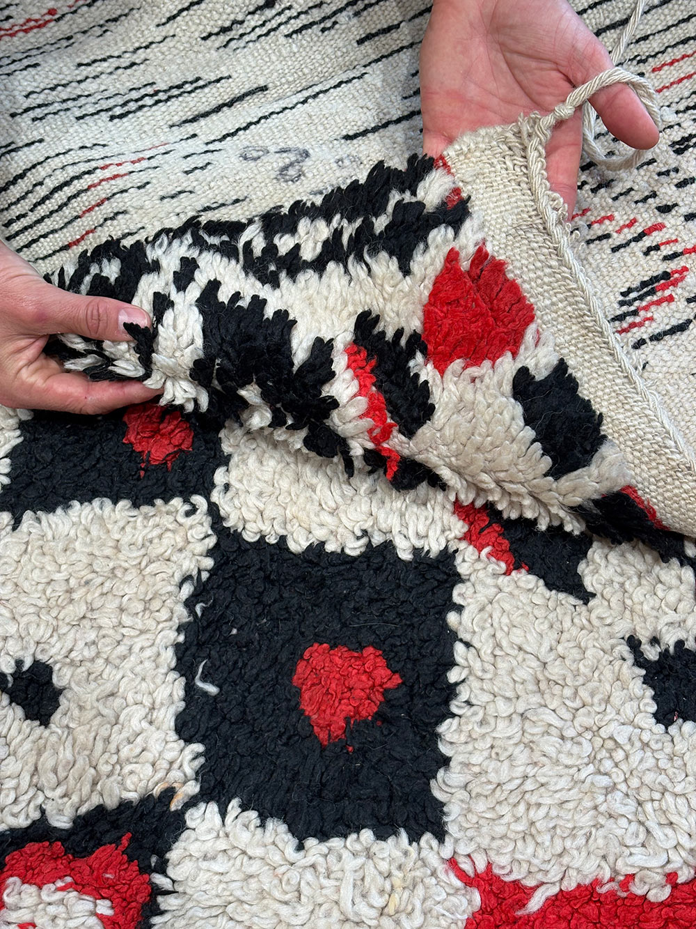 Another feature of the Azilal Berber Rug is its natural dye work. Artisans use saffron, henna, indigo, madder, and other plant-based sources to produce striking reds, yellows, and blues. These colors are applied sparingly against the cream wool ground, creating a lively contrast that feels both organic and modern. Over time, the natural dyes mellow, giving the rug a patina that only deepens its character.