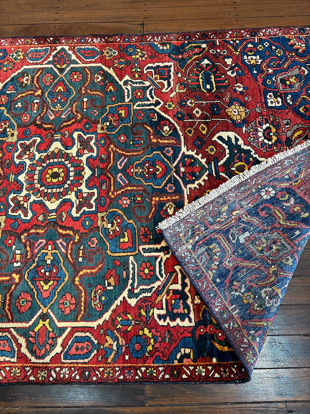 The palette of the Persian Antique Bakhtiari Rug is as rich as the land from which it comes. Deep madder reds dominate, symbolising vitality and strength. Indigo blues evoke water, life, and infinity. Natural ivory highlights bring balance, while earthy browns and greens connect the rug to soil and mountain.