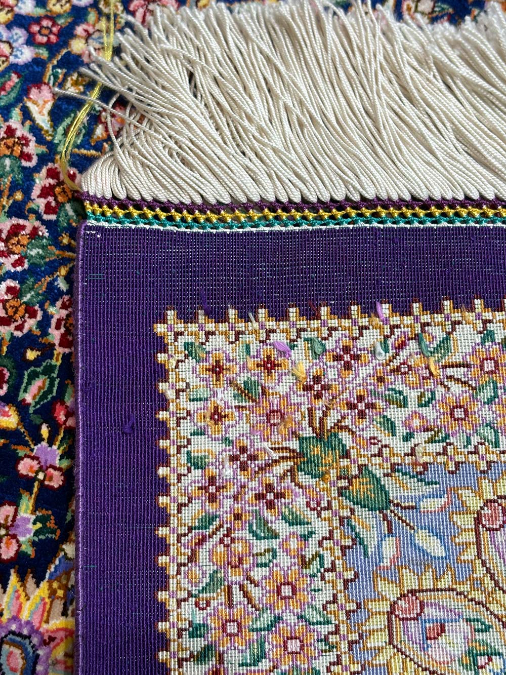 The colours in this Qum Silk Masterpiece Rug are rich and harmonious. Whether using soft ivory, deep navy, rose, sage or gold, the palette is arranged with sensitivity so that each shade finds its place in the visual conversation. There are no harsh transitions and no careless contrasts. Everything is deliberate. Persian silk dyes are known for their clarity and brightness, and when applied to a composition of this refinement, they elevate the rug to a true work of art.