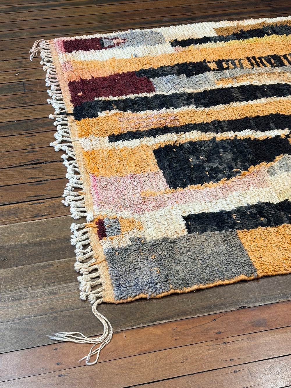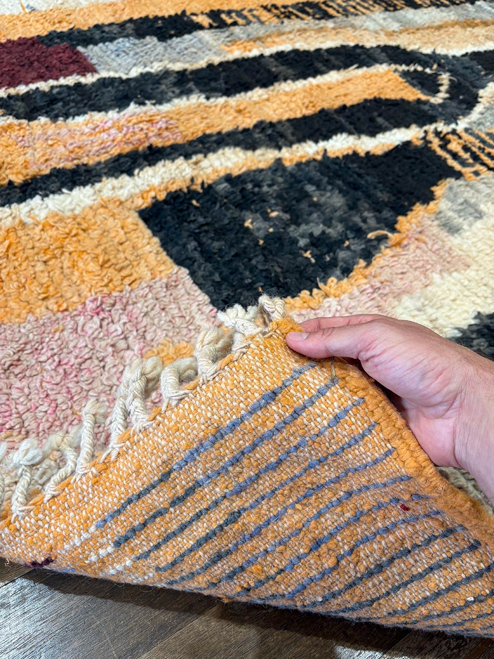 Every Vintage Boujad Rug begins with wool from local sheep, rich in natural lanolin and perfectly suited to the Moroccan climate. The wool is hand-spun and knotted on a vertical loom, producing a soft, almost velvety pile. This texture, combined with the natural irregularities of the weaving, gives each rug a tactile authenticity impossible to replicate by machine.